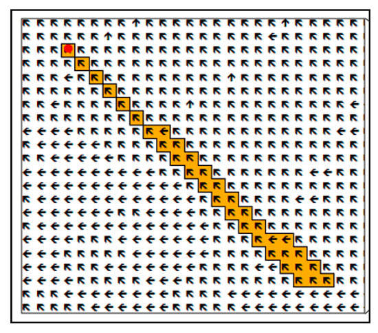 In order to determine the inflow areas of measuring points, groundwater flow directions (calculation of the maximum gradient to one of the eight adjacent cells) and the corresponding catchment areas can be derived from digital groundwater surfaces using a flow accumulation algorithm [49] implemented in the tool r.watershed of GIS GRASS (see Figure 4).