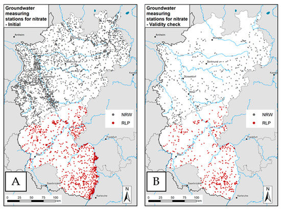 Initially available monitoring sites from state measuring networks in North Rhine-Westphalia (NRW) and Rhineland-Palatinate (RLP) (A) and preselected monitoring points included in the plausibility check (B).
