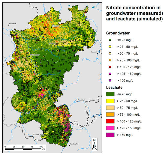All areas in Figure 3A showing nitrate concentrations in the leachate of 50 mg NO3/L and more can be regarded as “hot spot areas” for nitrate pollution. This concerns many regions in the northern and western parts of North Rhine-Westphalia (Münsterland, Lower Rhine Embayment) as well as in the southwest of Rhineland-Palatinate (Upper Rhine Valley) and in the Neuwieder Becken. In the Münsterland, the hotspot areas are exclusively due to high agricultural N balance surpluses originating from livestock farming (see Figure 2B). In the Lower Rhine Embayment, the Upper Rhine Valley, and the Neuwieder Becken, N emissions from soil are moderate. In these regions, high nitrate concentrations are also caused by low leachate rates. Particular high values of 150 mg NO3/L and more are found in some areas in the Upper Rhine Valley and in the Vorderpfalz due to the combination of special crops cultivation and low leachate rates. In contrast, extended areas showing nitrate concentrations in the leachate <25 mg NO3/L occur in both federal states, especially in extensively farmed low mountain regions, where relatively low N-emissions from soil are considerably diluted by high leachate rates.