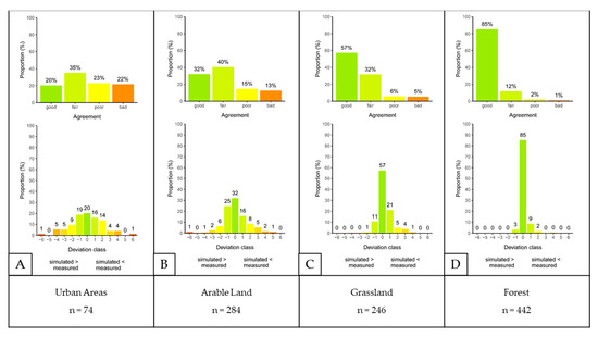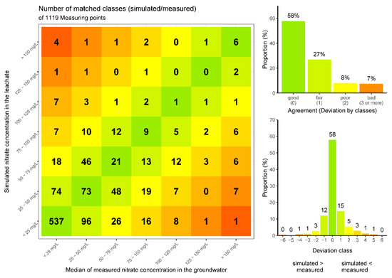 Figure 7 additionally shows the comparison of the class widths of the modelled nitrate concentrations in leachate and the measured nitrate concentrations in groundwater as frequency distributions. In this context, the agreement is denoted as being good, if observed and measured concentrations are in the same category; fair, if there is a deviation of one category; poor if the deviation is of two categories; and bad if there is a deviation of more than two classes.