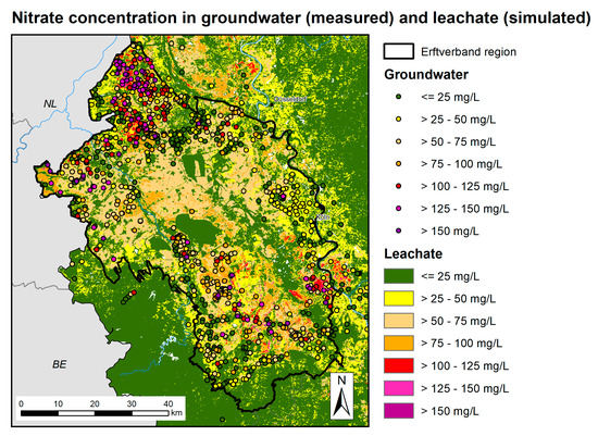 Spatial representation of class widths of modelled nitrate concentrations in leachate with measured nitrate concentrations in groundwater in the area of responsibility of the Erftverband.