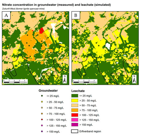 Comparison of the nitrate concentration in the leachate (grids) with measured nitrate concentrations in groundwater (dots) for an area of the former opencast mine Zukunft-West before (A) and after (B) adapting the denitrification conditions of the soil class “soil made of backfill material”.