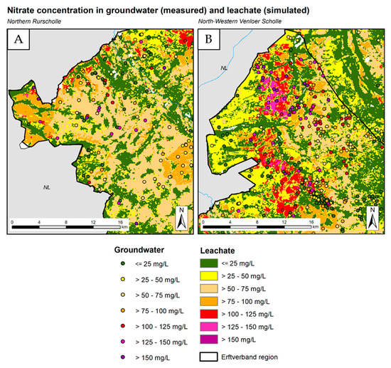 Large deviations between the modelled and the measured values were also found for individual measuring points for the northern Rurscholle (Figure 12A) and for the northwestern Venloer Scholle (Figure 12B). There, modelled nitrate concentrations in the leachate in the range of 75–100 mg NO3//L contrast with nitrate concentrations in groundwater in the range of >150 mg NO3/L.