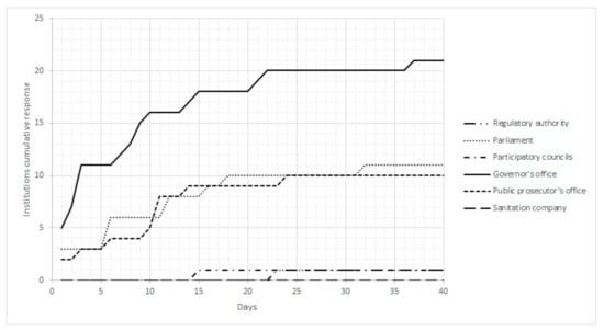 Figure 1 and Figure 2 show an overview of the relationship between elapsed days and the cumulative policy responses. In Figure 1, it is possible to observe that the first three weeks of the coronavirus pandemic in the states represented the most intensive period in institutional responses: 72% of the policy responses were issued in this 21-day time interval, with an average of 0.5 responses per day. Figure 2 provides an overview of policy responses per institution per day. As shown, the Governor’s Office had the most intensive policy responses to the coronavirus outbreak, clustering 47% of the measured events in the first 40 days. The second and third most intensive responses were from the Parliament, 25% of measured events, and the Public Prosecutor’s Office, 22.7% of measured events. The three least responsive institutions were the participatory councils and the regulatory authority, both with 2.3% of measured events, as well as the water and sanitation service providers, which had no official measured responses.