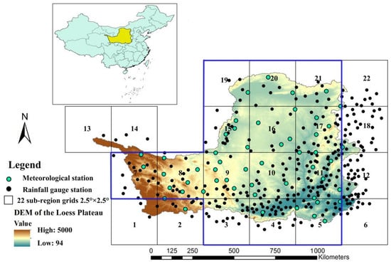 Geographical location of the Loess Plateau and distribution of meteorological stations and 22 sub-regions.