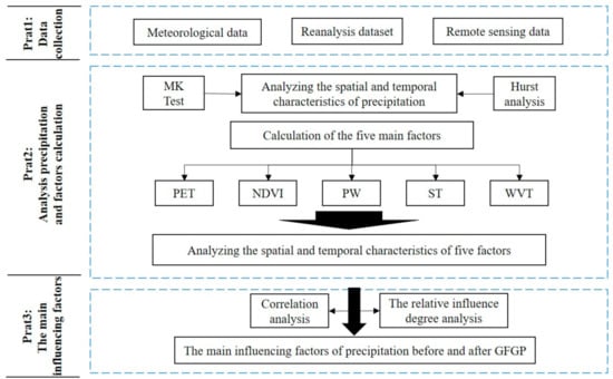 This paper aims to study the change in precipitation before and after the implementation of the Grain for Green Project (GFGP) in the Loess Plateau and to analyze the main influencing forces behind this. First, the Mann–Kendall (M-K) test and Hurst analysis method are used to study the trend and persistence of precipitation before and after the GFGP in the Loess Plateau at the spatial-temporal scale. Then, five main factors were selected, including PET, NDVI, PW, ST, and WVT, and their changes were analyzed at spatial-temporal scales. Finally, the statistical method was implemented to quantitatively evaluate the main influencing factors of precipitation before and after the GFGP. The research framework of this article is as shown in Figure 2.