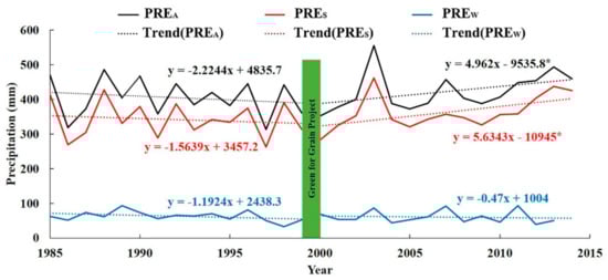 In this study, we defined the period before the GFGP as base Period I (1985–1999), and the period after the GFGP as change Period II (2000–2014). The precipitation in the Loess Plateau is concentrated in summer and autumn, and the seasonal precipitation fluctuates greatly. Therefore, we defined the summer scale as April to September and the winter scale as October to March. Then, the temporal variability of precipitation is shown in Figure 3.