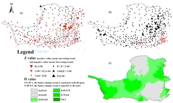 The Z value based on the Mann–Kendall (M-K) test used to study the trend of precipitation in Period I (a) and Period II (b), and the H value based on Hurst analysis used to study the continuity of precipitation after the Grain for Green Project (GFGP) (c).