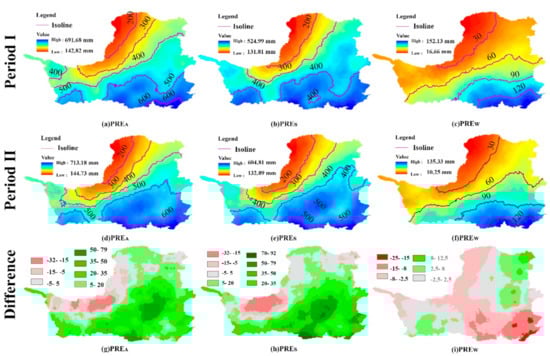 The spatial distribution of precipitation in Period I ((a) annual precipitation PREA, (b) summer precipitation PRES, (c) winter precipitation PREW) and Period II (d,e,f) and the difference in precipitation between the two periods (g,h,i).
