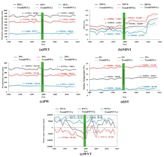 In this study, we aim to analyze the main driving factors of precipitation in the condition of vegetation recovery and climate change, and comprehensively considered five factors. PET is selected as the climate factor, NDVI and ST as the underlying surface change factor, and PW and WVT as the water vapor factor of atmospheric circulation. Moreover, CO2 is also a potential influencing factor worthy of consideration. However, the previous study showed that the elevated CO2 was not the most primary factor for ET change in the Three-North Region including the Loess Plateau in China []. Meanwhile, there are no gridded data of CO2 concentration from 1985 to 2014 in the world. Therefore, we decided not to consider the effect of CO2 in this study. Finally, the five main factors are calculated as follows.