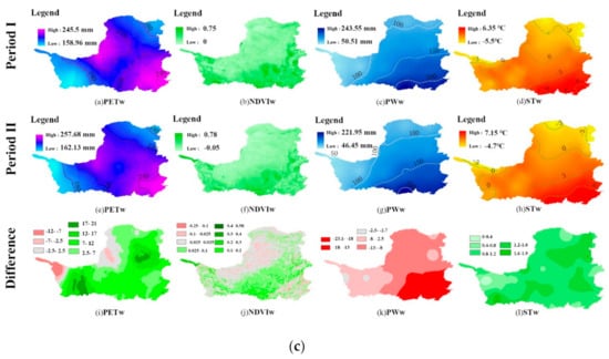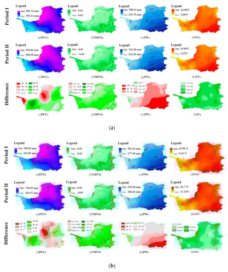 To further analyze the spatial distribution and variation of each factor in Period I and Period II, the spatial distribution of each factor in the annual and seasonal scales and spatial difference between the two periods were mapped, respectively, in Figure 7a–c. It is worth noting that the WVT is the water vapor flux value of the entire Loess Plateau, which cannot present spatial distribution.