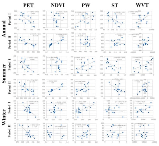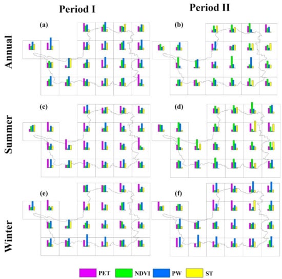As shown in Figure 7a–c, from the perspective of spatial distribution, the spatial distribution, NDVI, and PW of the annual, summer, and winter scales showed a decreasing trend from the southeast to northwest, similar to the spatial distribution of precipitation. The higher values of PET are distributed in the northwest, central, and southeast. The lower values of ST are distributed in the southwest. From the perspective of spatial variation, the NDVI in the southeast increased significantly in the annual, summer, and winter scales, similar to those of precipitation. At the same time, PET increased in the southwest and northeast, ST increased in the whole area, while PW decreased in the whole area. To sum up, NDVI was similar to precipitation in spatial distribution and variation. Meanwhile, PET, NDVI, and ST all increased after the GFGP.