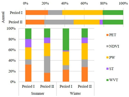 The influence degree of factors to precipitation before and after the GFGP is shown in Figure 9. In terms of annual scale, PW had the greatest influence on precipitation in Period I, with a relative influence degree of 41.33%; in Period II, NDVI and PW had the greatest impact on precipitation, with relative influence degrees of 30.18 and 26.63%, respectively. In terms of the summer season, PET and PW influenced precipitation most in Period I, with relative influence degrees of 32.17% and 22.63%, respectively; while in Period II, NDVI and PW had the greatest impact on precipitation, with relative influence degrees of 31.37 and 24.26%, respectively. In terms of the winter season, WVT and PW had the greatest influence on precipitation in Period I, with relative influence degrees of 41.21% and 25.50%, respectively; while in Period II, PW and PET had the greatest impact on precipitation, with relative influence degrees of 30.13% and 27.64%, respectively.