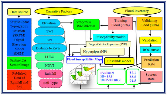 In this research, we have chosen a sub-tropical river basin of Koiya River as a study area for FS assessment. Our main research objective is to prepare spatial prediction of FS maps for mitigation and sustainable management of flooding activities. Basically, this type of research study is not based on a specific time period, usually this type of work has analyzed the spatial prediction of flooding and not within a certain time period, until we have considered the climate change phenomena. If we considered prediction of FS under climate change activities, then it should be bounded by certain time period. However, the duration of flood time window (few days to few weeks) has been largely dependent on local geo-environmental factors i.e., duration and intensity of rainfall, percentage of vegetation cover, elevation and more. Thus, to progress in our work on FS assessment, here we have selected a total of eight flood susceptibility conditioning factors (FSCFs) based on the topography and hydro-climatological conditions, and these factors are land use land cover (LULC), soil type, rainfall, normalized difference vegetation index (NDVI), distance to river, elevation, topographic wetness index (TWI), and stream power index (SPI), as these condition have direct or indirect influence on the occurrences of flood. All of these factors are widely responsible for recurrent flooding and the associated risks. An inventory flood map was also prepared based on the historical data of 132 flood points, because an inventory map is the foremost condition for modelling FS assessment. The variables’ importance for occurrences of flood was identified through the random forest (RF) algorithm. The present research work of FS modeling and mapping was carried out by using the two ML algorithms of hyperpipes (HP) and support vector regression (SVR); and the novel ensemble of HP-SVR approach was employed for better analysis of prediction result. Literature study has shown that the HP algorithm was used in landslide susceptibility analysis and several ensemble approaches with HP gave better result than single HP. Thus, the best of our knowledge and intensive studies have shown that the ensemble of HP-SVR has not been used before for FS mapping; therefore, this ensemble approach is the novelty in this research study. The respective model’s output result was validated through five popular statistical indices including receiver operating characteristics (ROC) curve analysis.