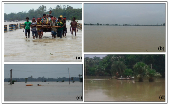 Field photographs showing flood inundation area in the present study area: (a). Concrete bridge under the water (23°48′20.26″ N, 87°49′10.67″ E), (b). Flooding in the large area (23°52′13.74″ N, 88°2′45.89″ E), (c). Car and houses flow with flooding water (23°50′25.01″ N, 87°58′4.20″ E), (d). Local boat is the main medium of communication during flooding (23°55′17.30″ N, 88°5′38.22″ E).
