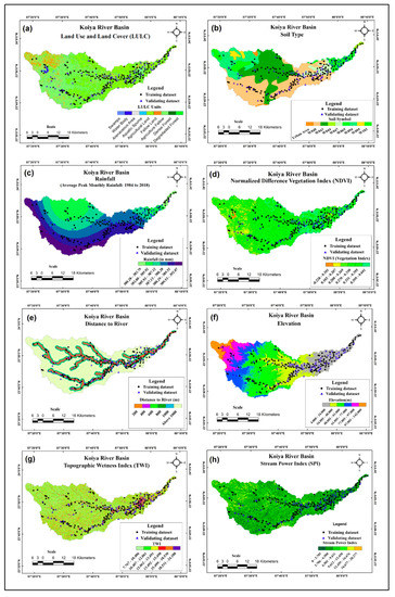 Flood causative factors; (a) land use land cover (LULC), (b) soil type, (c) rainfall, (d) normalized difference vegetation index (NDVI),(e) distance to river, (f) elevation, (g) topographic wetness index (TWI), and (h) stream power index (SPI).