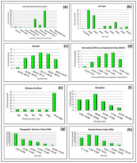 Percentage of area of respective flood causative factors; (a) LULC, (b) soil type, (c) rainfall, (d) NDVI, (e) distance to river, (f) elevation, (g) TWI, and (h) SPI.
