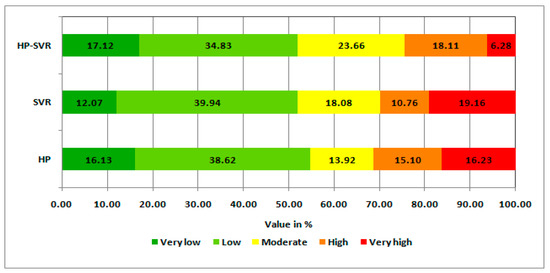 The present research work of FS assessment was carried out using two ML algorithms of SVR and HP and one ensemble approach of SVR-HP in the Koiya river basin of Bengal Basin. The aforementioned model’s output maps are presented in Figure 6. In the purpose of better understanding the spatial distribution and their variation, all of these model’s output maps were classified into five categories by using Jenk’s natural breaks methods in the ArcGIS 10.4 platform. These classifications are very low, low, moderate, high, and very high, and have been symbolized with the same color for every zone in the respective maps prepared through ML algorithms. All of these maps have shown near regularity among the several susceptibility zones prepared for FS mapping. The FS map prepared through the SVR model is presented in Figure 6a and respective aerial coverage of five zones, i.e., very low, low, moderate, high, and very high are173.01 (12.07%), 572.55 (39.94%), 259.22 (18.08%), 154.23 (10.76%), and 274.69 (19.16%) km2 respectively (Figure 7). In the case of the HP model, the prepared FS map is shown in Figure 6b and aerial coverage by five zones, i.e., very low is 231.29 (16.13%), low is 553.69 (38.62%), moderate is 199.50 (13.92%), high is 216.51 (15.10%), and very high is 232.70 (16.23%) km2 (Figure 7). The ensemble of SVR-HP approach’s produced map is presented in Figure 6c and the aerial coverage and respective percentage of five zones, i.e., very low, low, moderate, high, and very high are 245.50 (17.12%), 499.31 (34.83%), 339.19 (23.66%), 259.61 (18.11%), and 90.09 (6.28%) sq. km, respectively (Figure 7). Among the three methods, ensemble of HP-SVR mapping shows the greatest area (245.50 km2) of very low FS zones followed by HP (231.29 sq.km) and SVR (173.01 km2). On the other side, the largest area of very high FS zone is covered by the SVR-produced map (274.69 km2) followed by HP (232.70 km2) and HP-SVR (90.09 km2). As a general rule, very high flood prone areas are found in the lower courses of the present river basin area and very low flood prone areas are found in the upper courses of the river, as was found in this research study.