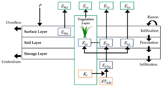 Definition of the vegetation layer and the ET components within the existing LID-soil model. ( = Precipitation, = crop factor, = shading impacted FAO-grass reference evaporation, = plant specific potential ET, = pot. interception, = pot. transpiration, = pot. soil evaporation, = pot. evaporation of free water surface, = actual evaporation of free water surface, = actual interception, = actual transpiration, = actual soil evaporation)—modified after [34].