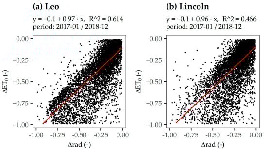 With the help of this relationship, the reduction in the available short-wave radiation from the reference station to the considered location () can be converted into the shading factor (−, Figure 1d).
