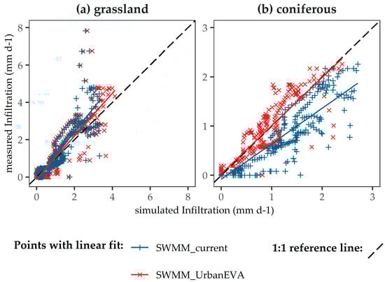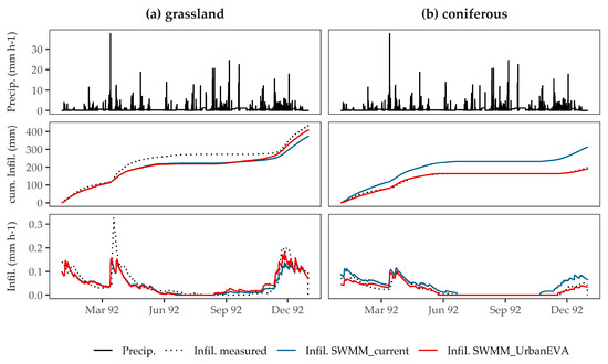 For model development of SM2 measured data of the full scale lysimeter St. Arnold, which is located 30 km north west of Münster, were used. The lysimeter consists of three non-weighable lysimetrical basins, each with dimensions of 20 m × 20 m × 3.50 m, no groundwater contact, and representing three forms of vegetation (grassland, coniferous, and deciduous trees). Starting in 1965, infiltration rates of the different vegetation forms, as well as climate data, have been collected until today on a daily basis [67]. Due to sandy soil, no surface runoff occurs in St. Arnold [68]. The lysimeter has a long-term average of 793 mm precipitation and 460 mm per year which means that the amount of precipitation is higher than in Münster, while is a bit lower.