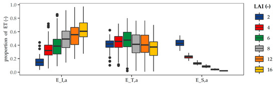 To further differentiate between interception evaporation and transpiration, an assignment is made via the water-wetted leaf area (-) according to [59,60].