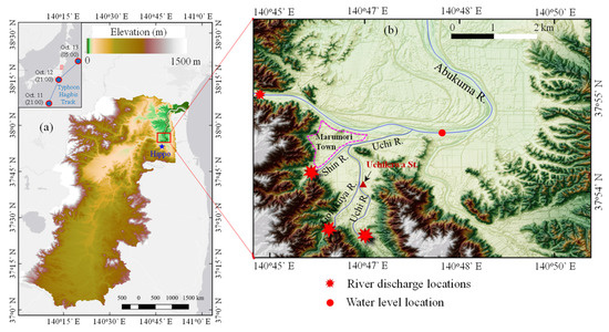 The Abukuma River Basin in Miyagi Prefecture was one of the most severely damaged places during Typhoon Hagibis. This was probably due to the typhoon’s track resembling the river’s mainstream direction from south to north, as seen in Figure 1a. The rainfall at Hippo Station, located upstream of the Abukuma River, received nearly 600 mm in 24 h, resulting in more than 47 levee breaching locations along the river and its tributaries, especially along the Uchi River, Shin River, and Gofukuya River. Consequently, Marumori Town was severe flooding, causing 10 dead, two injured, and more than 1000 houses were damaged [4].