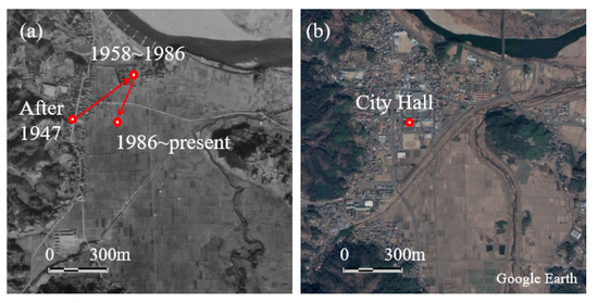 Figure 2a shows the City Hall’s historical movement on the aerial photo in 1947 and compared with the latest Google Earth Image in Figure 2b. According to Figure 2, the current residential area and the city hall were relocated from a high-altitude mountain area to the low land paddy field area over the past 73 years. Due to this, Marumori Town is highly exposed to flood disasters if there is an occurrence of typhoon.
