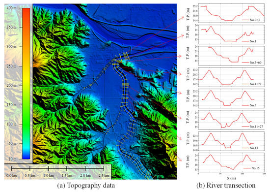 (a) 5 m-topography data of the Marumori area, (b) measured transects of tributaries.
