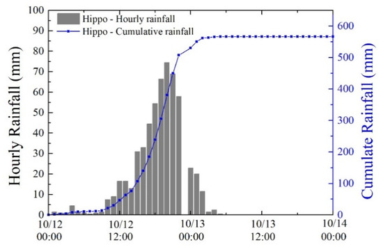 In order to achieve the above objectives, the required datasets are the topography data, river discharge, water level, and rainfall data. In the present study, the 5 m-resolution topography data were obtained from the Geospatial Information Authority of Japan (GSI) [5]. The river transects data were provided from the local river authority, as shown in Figure 3. The Abukuma River discharge and water level as well as the rainfall data were obtained from the Ministry of Land, Infrastructure, Transport, and Tourism (MLIT). Figure 4 shows the rainfall data at the Hippo Station, and its location is shown in Figure 1a. The maximum observed hourly rainfall was 74.5 mm, and the cumulate rainfall reached was 587.5 mm in two days, making a record-breaking rainfall with a return period of around 500 years in this area.