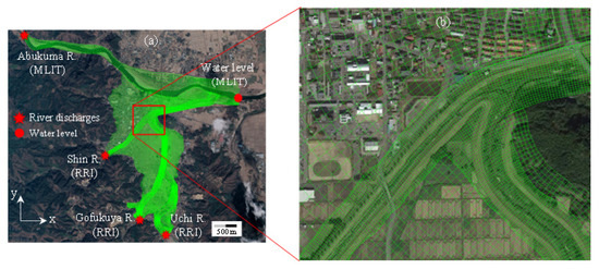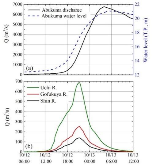 Figure 6 shows the time-series of river discharges and water levels at the boundary locations, as shown in Figure 5. The Abukuma River discharge and water level data during Typhoon Hagibis were collected from the MLIT, while the upstream river discharges of the Uchi River and the Gofukuya River were output results from the RRI model. In addition, the observed rainfall data at Hippo Station were used as the atmospheric boundary. Finally, the dimensionless roughness height was set based on the landcover surface types; for example, 0.03 for the river channel and 0.05 for the paddy field.