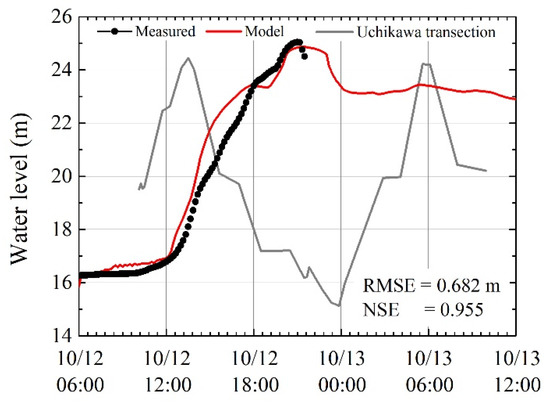 Time-series comparison result of the modeled and measured water level data at Uchikawa Station.