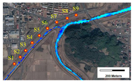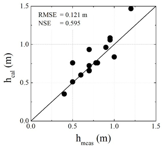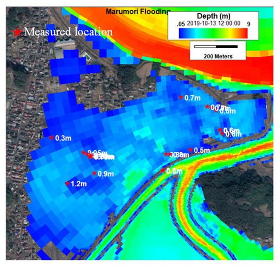 Figure 8 shows the model inundation map in the Marumori Town and flood marks’ survey locations on 19 October 2019. Figure 9 is the comparison results of the model versus data for the inundation depth in the Marumori Town area. The small values of RMSE indicate that the model can successfully reproduce the inundation depth in Marumori Town.