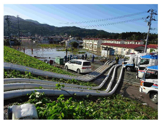 On 13 October 2019, we conducted a field survey of the situation in the center of Marumori Town and the riverbank’s damages along the tributaries one day after the typhoon. The center of the town is located in a triangular area, extending east to west between the mainstream Abukuma River and the Shin River’s left-side, as shown in Figure 1. Marumori Town experienced flood disasters with a cumulated rainfall exceeding 400 mm during Typhoon No. 10 on 5 August 1986 [25]. However, the flood-induced disaster by Typhoon Hagibis was the most severe. Immediately after the typhoon, the municipal government believed that the flooding in the town was caused by the Abukuma riverbank’s breach and water overflow from the left side of the Shin River. However, according to our observation results, no breach happened on the Abukuma riverbank and the Shin River’s left riverbank. The town’s floodwaters were mainly from the direct intensive rainfall, and water flowed from a nearby mountainside. In addition, the massive amount of floodwater to the city far exceeded the capacity of the drainage pumps to the Shin River (Figure 10). Therefore, the inundation depth was high and exceeded 3 m in some areas.