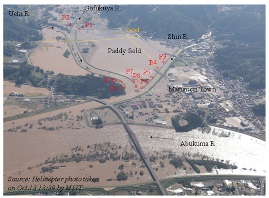 According to the field survey results, the levee breached position in the Gofukuya River (P1) was the most severe location (Figure 12a). The levee was destroyed entirely for more than 60 m, causing a large amount of water from the Gofukuya and Uchi Rivers to flow into the paddy field area. Many levee portions were breached at the Uchi River and Gogukuya River’s confluence due to the river water level rise that surpassed the embankment crest (Figure 7).
