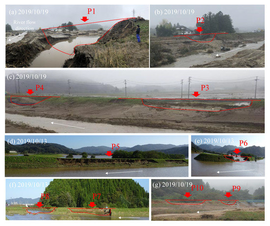 Post-event photographs of levee breaches at corresponding locations from the P1 to P10 in Figure 11 along the Uchi, Gofukuya, and Shin Rivers.