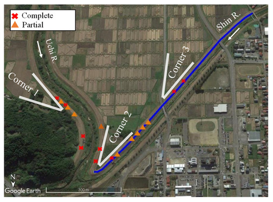 A detailed survey by helicopter was carried out one day after the flood disaster by MLIT. Figure 11 is a photo taken from a helicopter. There were 18 levee breaching locations, of which 10 were in the Uchi River, four in the Shin River, and four in the Gofukuya River. There were 10 major levee breach positions, as shown in Figure 11. Figure 12 shows a closer-view photo of the breached portions taken in two surveys on 13 October and 19 October 2019. Based on the level of levee damage, the present study categorized the damage into three different levels as shown in Figure 13: (1) Complete damage level, (2) partial damage level, and (3) no-damage.