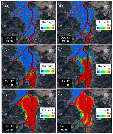Figure 15 shows a series of snapshots from the numerical simulation results of the flood propagation process. In this simulation, a constant 100 mg/l of dye was assigned to the inflow boundaries of three tributaries to track floodwater movement over land areas. Therefore, the warm color indicates the incoming floodwater, and the cold color is the rainfall water.