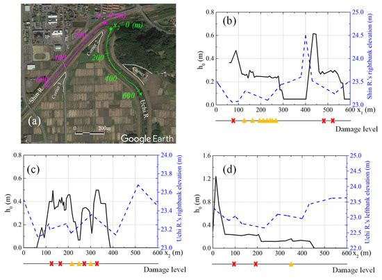 In order to investigate the flow characteristics that caused the levee breaching, the maximum overflow water depth on the levee crest was extracted from the model results. Figure 16a shows where the extracting lines and were set for the Shin River and Uchi River, where the star symbol indicates the origin of coordinates. Figure 16b–d respectively shows the longitudinal variation of the maximum overflow depth () on the Shin River’s right-bank, Uchi River’s right-bank, and Uchi River’s left-bank. In these figures, the location and levee damage levels, as observed in Figure 14, are also shown. As shown in Figure 16, the higher overflow depth has occurred in the constricted corners 1 to 3. In addition, the complete levee damage has corresponded well to the location of enormous overflow depth.