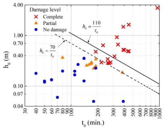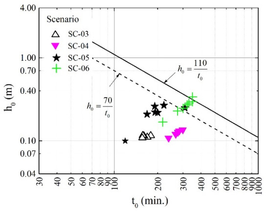 According to Suga et al. [18], the levee breaching criterion can be defined as a function of the maximum overflow depth ( and its overflow duration (). Based on the simulation results, these parameters can be extracted at all damaged locations, as shown in Figure 17. From this analyzed result, it can be seen that complete levee damage is more likely to occur when the overflow depth reaches 0.4 m and remains for a duration of 200 min. Based on the collected data, Suga et al. [24] proposed a criterion for the complete levee breaching as follows: