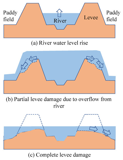 Breaching mechanism of the upstream levee location: (a) River water level rise, (b) Partial levee damage due to overflow from river, (c) Complete levee damage.