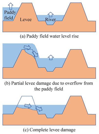 Breaching mechanism of the downstream levee locations: (a) Paddy field water level rise, (b) Partial Levee damage due to overflow from the paddy field, (c) Complete levee damage.