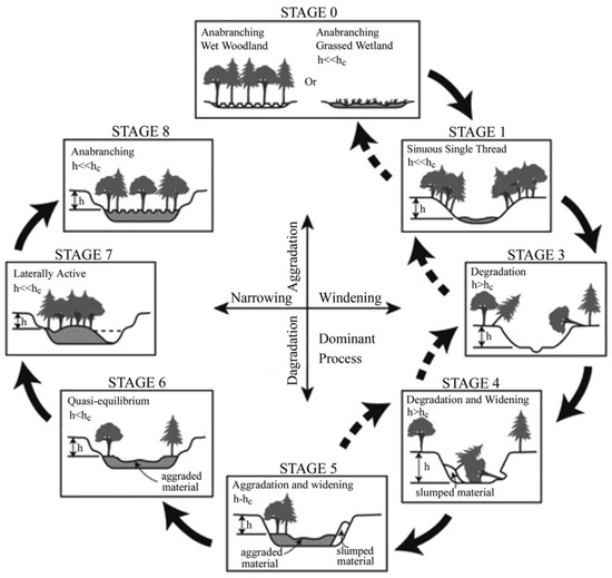 Developed model for channel adjustment, affected by massive sediment input in the North Toutle River (NFTR) [8] (h is the bank height, and hc is the critical stability bank height). Stage 2 in the original SEM is omitted as it is not relevant to the evolution of the upper NFTR. ‘Anabranching’ is used instead of ‘anastomosing’ in stages 0 and 8 to better reflect the conditions in the NFTR. Reprinted with permission from ref. [8]. Copyright 2021 John Wiley & Sons-Books.