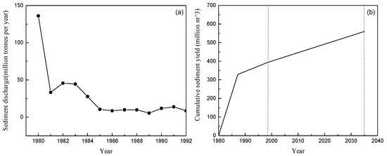 Sediment flux in NFTR. (a) Measured sediment flux [10]; (b) predicted cumulative sediment yield (dashed lines refer to 1999 and 2035) [15].