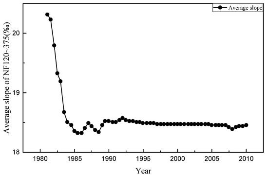 After the eruption of Mount St. Helens on 18 May 1980, the upstream of the NFTR was buried under a debris avalanche, which increased the channel slope. Figure 6 shows the adjustment of the averaged measured slope between sections N120 and N375 from the measured thalweg elevation of each cross section. At the beginning of the volcanic eruption, the initial average slope was steep because of the influence of volcanic collapse accumulation, as shown in Figure 6. After 1985, the measured slope remained stable. Combined analysis of discharge and sediment load showed that the channel reached the equilibrium water and sediment transport after 1985. At the same time, the measured average slope was basically stable.