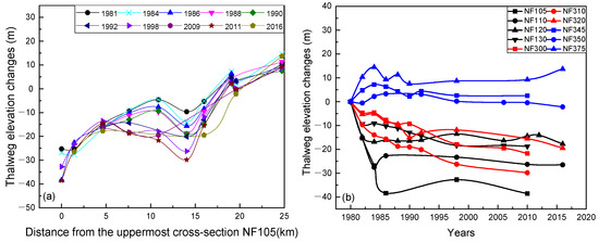 Elevation changes from the 1980-level in the NFTR. (a) Elevation changes along the channel since 1980; (b) elevation changes from 1980 for cross sections NF105–NF375.