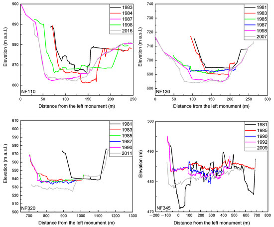 Figure 8 shows the time series of profiles for cross sections. As shown in Figure 8, each cross section still had a large adjustment. Cross section NF110 experienced degradation from 1980 to 1984, then aggradation from 1984 to 1998, and a return to degradation until 2016; cross section NF130 experienced degradation from 1980 to 1983, then aggradation from 1983 to 1987, and a return to degradation until 2007; cross section NF320 experienced degradation from 1980 to 1987, then aggradation from 1987 to 1990, and a return to degradation until 2011; cross section NF345 experienced aggradation from 1980 to 1985, then degradation from 1985 to 1990, and a return to degradation until 2009.