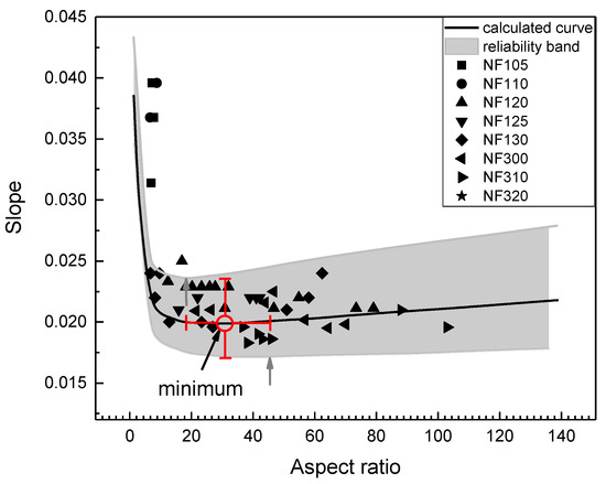 In Figure 9, the measured data are the geometries of the main channel in cross sections NF105–NF320 at different times after 1985. The aspect ratio of the main channel in the aggradation reach (NF345–NF375) was difficult to obtain due to the channel experiencing a complex flat adjustment (Figure 8). The calculated curve and reliability band were well fitted to the measured data, so the channel adjustment was basically along the calculated curve under equilibrium water and sediment transport after 1985. As shown in Figure 9, the channel achieved a stable state when the aspect ratio was 31 and the channel slope was 0.0201. The channel was adjusted around the extreme point along the calculated curve. The error bar of the extreme point in Figure 9 shows that the stable slope ranged from 0.017 to 0.023 (±15%); the stable aspect ratio ranged from 19 to 43 (±35%). However, the channel adjustment was much greater than the variation of the stable aspect ratio. The change amplitude of the aspect ratio was between 10 and 100, and this change amplitude will have caused severe adjustment of geometries of cross sections.