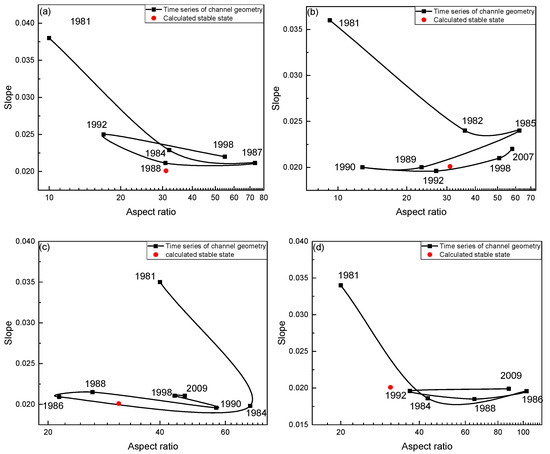 The extremal hypothesis has already been proven [23,24]. The field study in the NFTR also verified the extremal hypothesis [10]. Therefore, the channel will adjust to the extreme point. Figure 10 shows the time series of channel geometries for the researched cross sections. The calculated stable state (extremal point) for NF105–NF375 shown in Figure 9 is also presented. As shown in Figure 10, the channel adjustments continued after 1985, and these adjustments were not random; the aspect ratio had periodic adjustments with the channel slope along the calculated curve, and the aspect ratio continued to alternate between increasing and decreasing. The channel geometries of cross sections NF120, NF130, and NF300 were periodically adjusted around the extremal point along the calculated curve. The stable state was calculated by the mean discharge, particle size, and sediment flux of NF105–NF375. Therefore, there was a difference in different cross sections. The aspect ratios of cross section NF310 were larger than the calculated stable state, but the channel geometries of NF310 were also periodically adjusted along the calculated curve in a range.