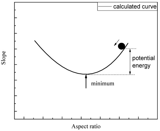 The adjustment processes in Figure 10 are similar to the ball rolling on the calculated curve. As shown in Figure 11, the ball will move to the extremal point under the action of potential energy when the ball is located at any point on the curve except the extremal point. However, after the ball reaches the extremal point, it will not stop immediately, but it continues moving due to the excessive compensation of potential energy. The potential energy continues to be consumed during the processes of periodic moving, and eventually, it stops at the extremal point. In the similar adjustment of channel, the aspect ratio continues to change. The aspect ratio increases stand for the channel widening and aggradation; the aspect ratio decreases stand for the channel narrowing and degradation. Therefore, the channel will still experience alternations of degradation and aggradation, and this adjustment may even last for decades.